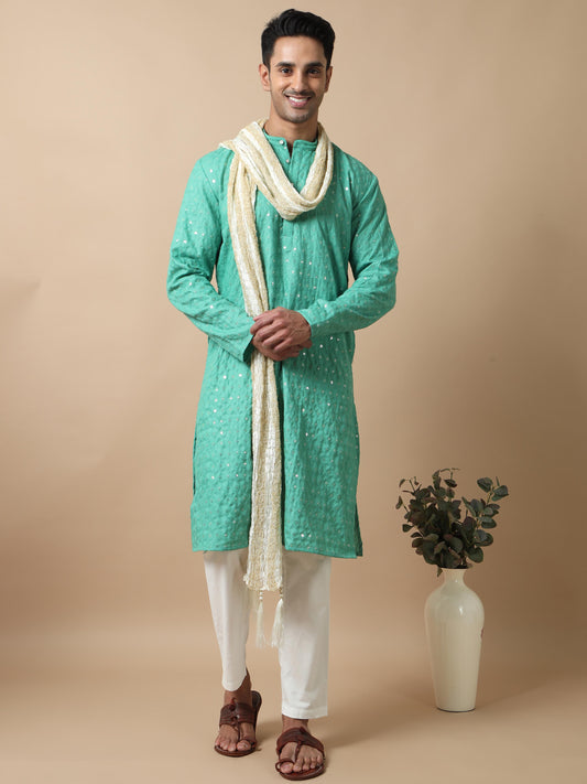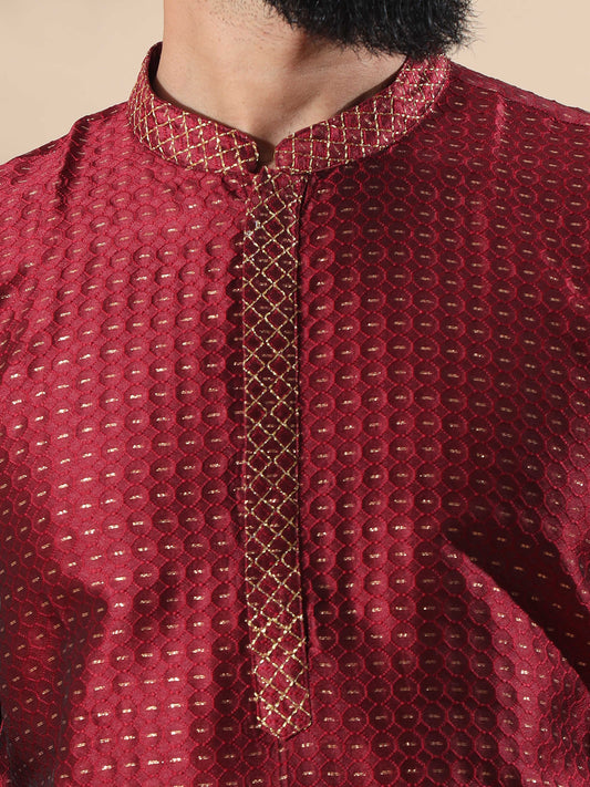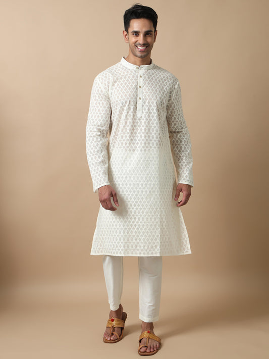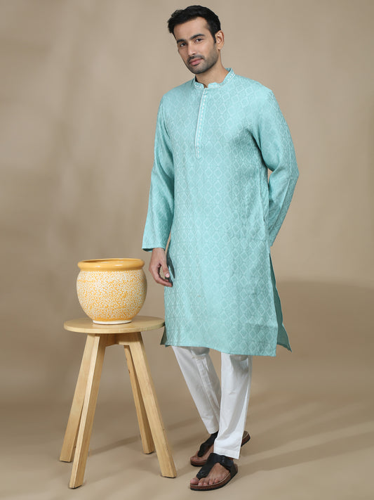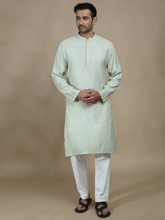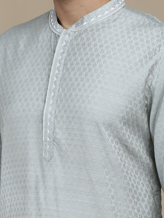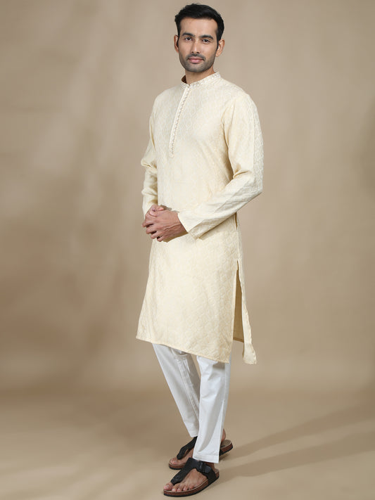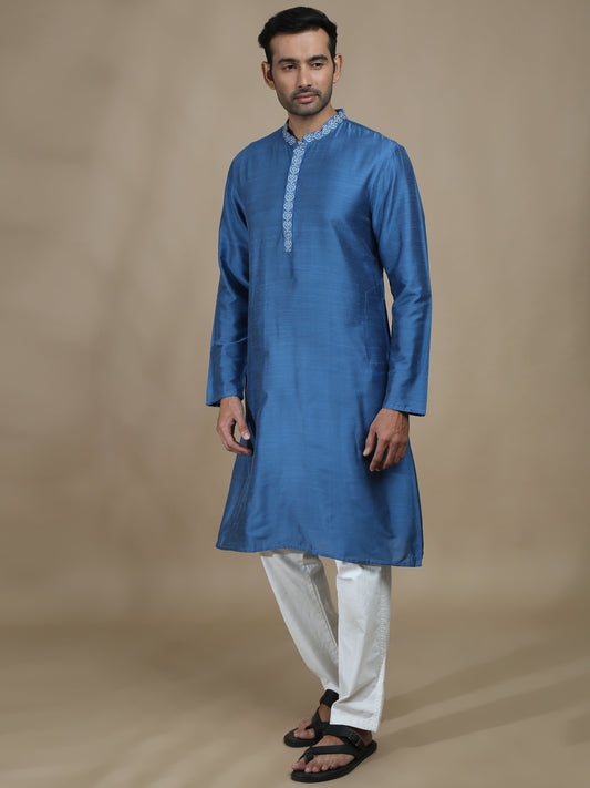 - Intricate Embroidery: Embroidery takes centre stage, with intricate thread work and embellishments adorning collars, cuffs, and plackets, elevating the aesthetic appeal of long kurta for men and adding a touch of opulence.