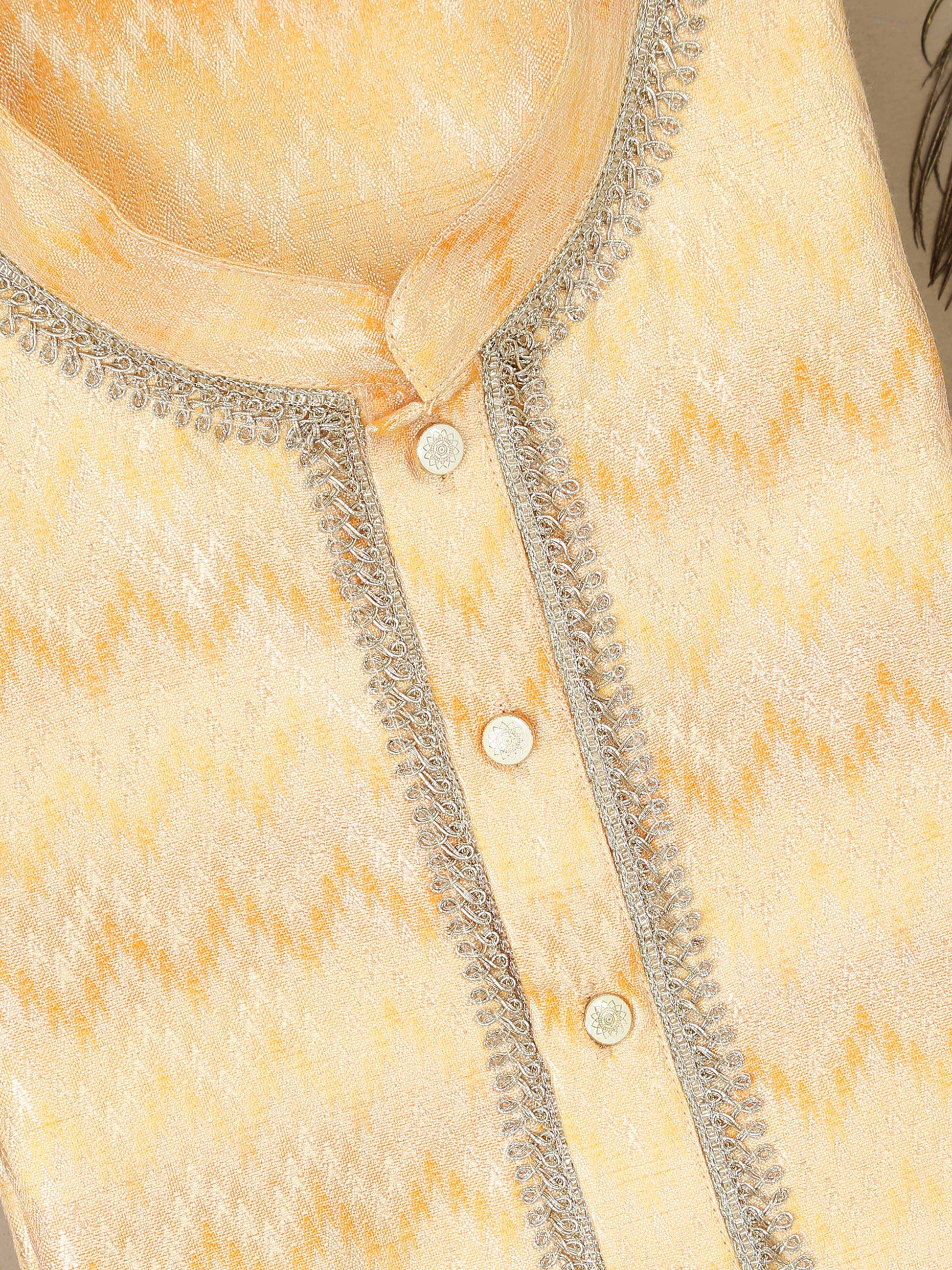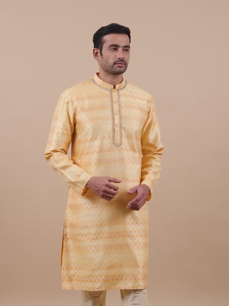 Inspired by the rich heritage of Banaras, each piece is meticulously woven with intricate motifs and delicate patterns, showcasing the skilled craftsmanship of our artisans. The luxurious texture and lustrous sheen of the brocade fabric elevate the kurta, making it perfect for special occasions or festive gatherings.
